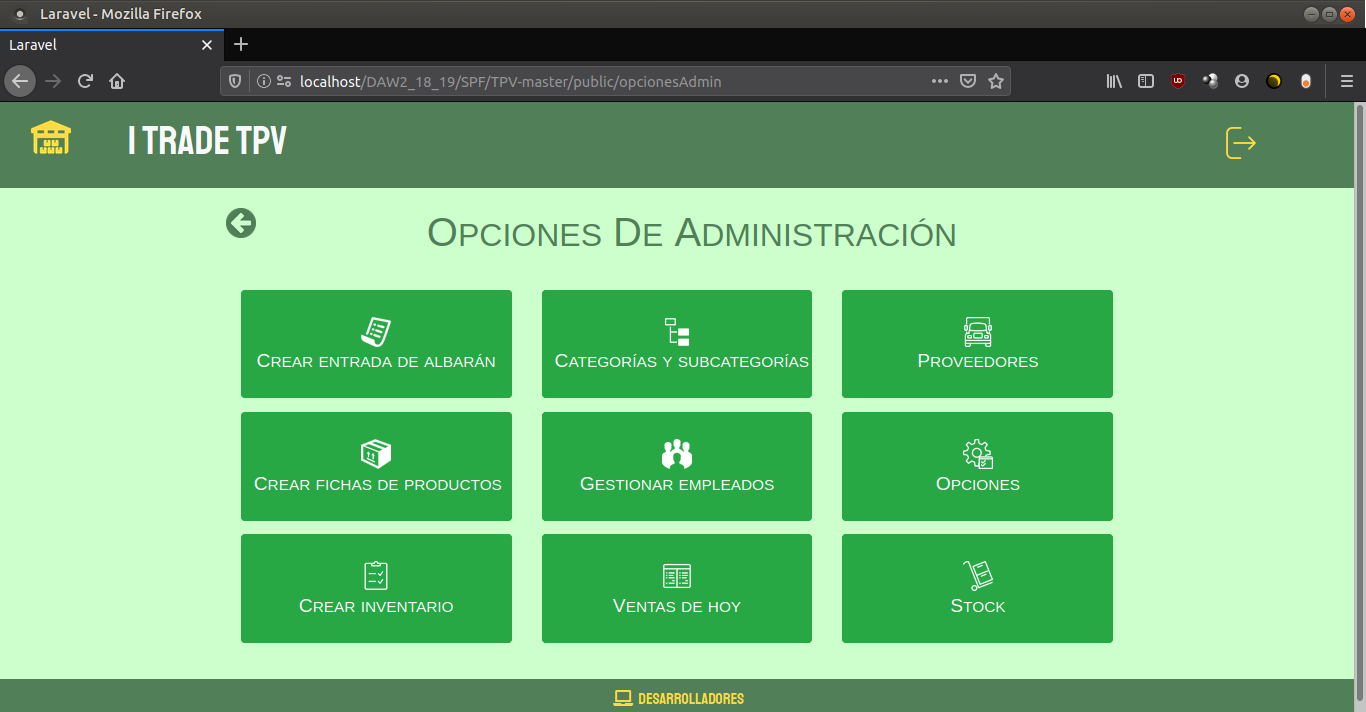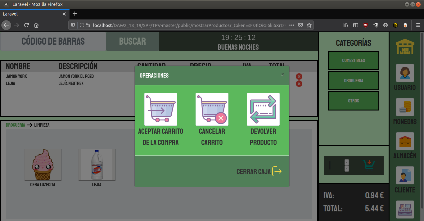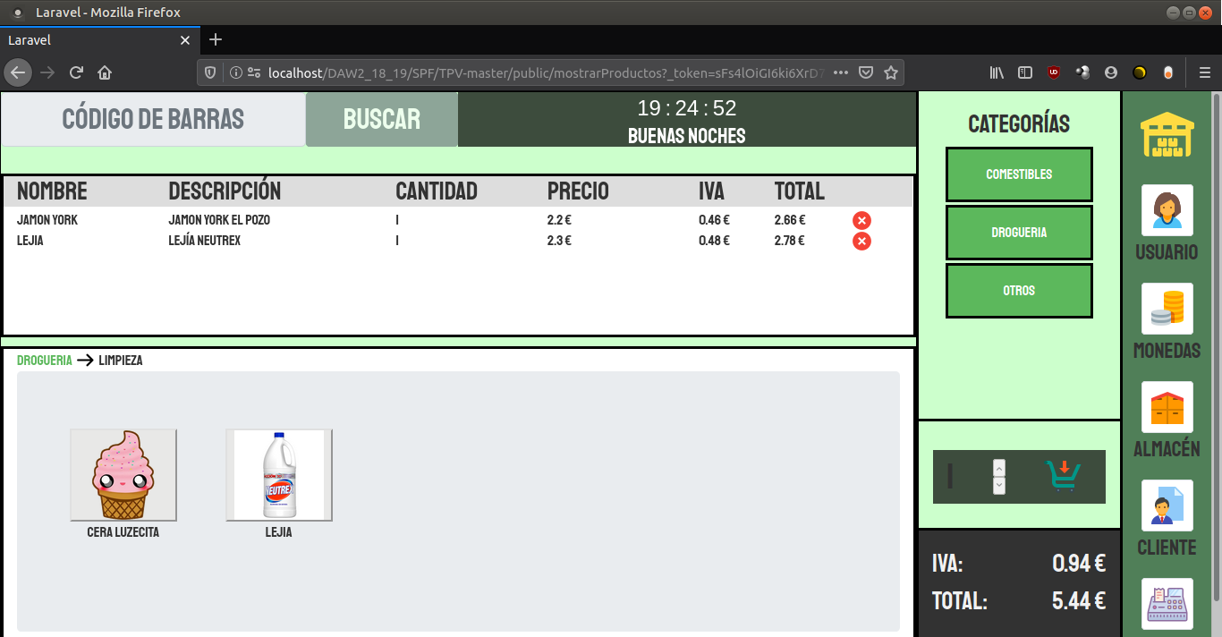 El sistema gestiona almacén y categorías del stock. Asimismo hace las funciones de TPV con realización de tickets y cobro.