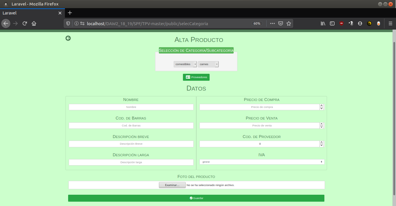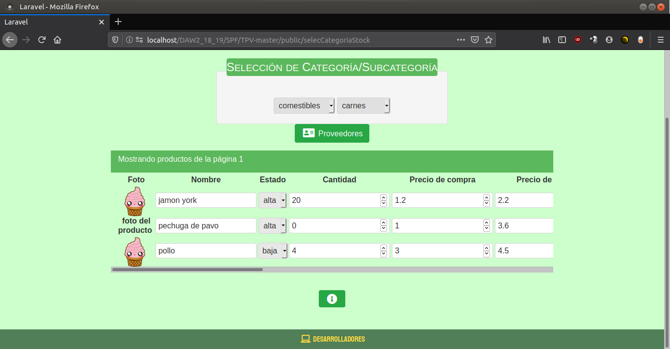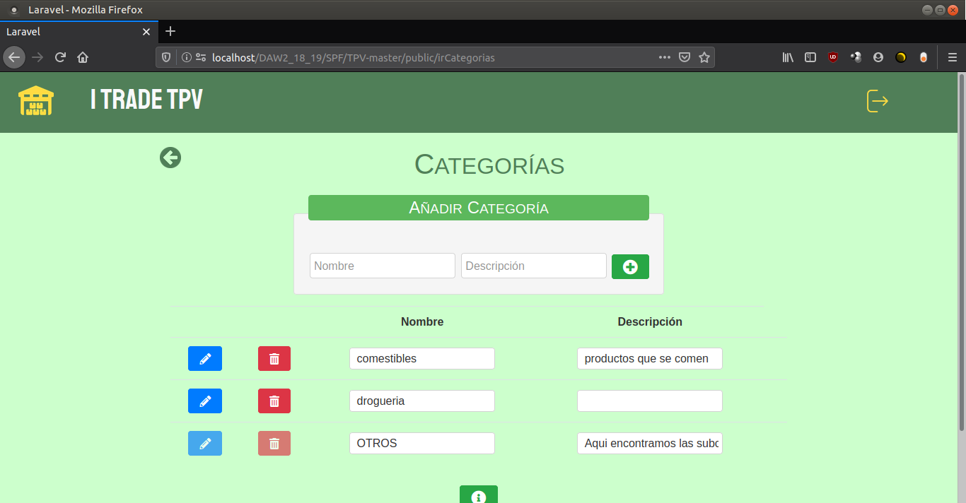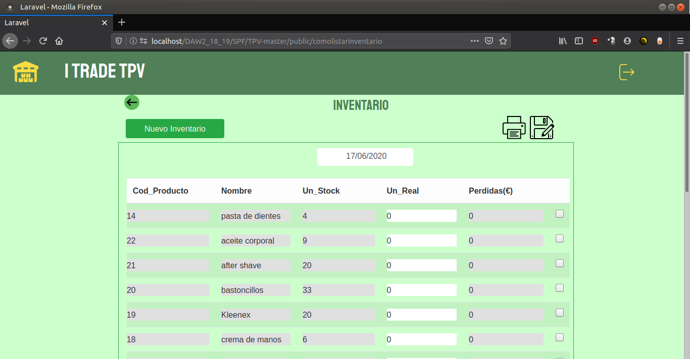 El sistema gestiona almacén y categorías del stock. Asimismo hace las funciones de TPV con realización de tickets y cobro.